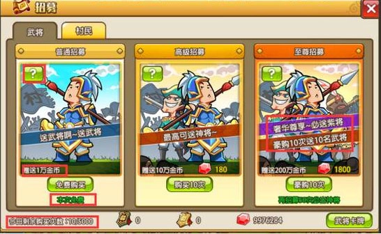 村长大人们可以在村庄界面下方点击【招募】→【武将】进入武将招募界面。每次招募都会额外赠送金币。