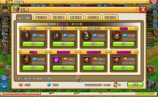 在【商城】→【宝殿】板块中,您可以前往【联盟宝殿】,使用蓝钻或黄玉牌兑换自己喜欢的武将。