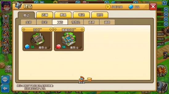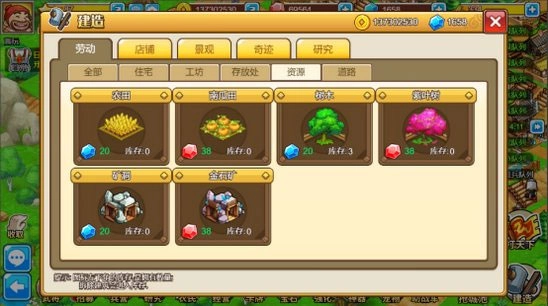 在【建造】→【劳动】→【资源】的分类下,能看到小小村长的三类核心资源:农田与南瓜田为小小村提供了稳定的粮食供给;树木和紫叶是村庄木材储备的重要保障;石矿与金矿则象征着小小村的富足与繁荣!