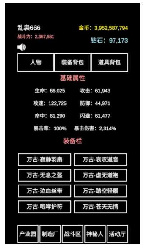 现在你既有钱又有钻石,可以放开玩啦。要是钻石数量够的话,建议入手钻石装备(绝对物超所值,买不了吃亏上当);要是钻石不够,买套金币装备凑合用也成(我目前就是一半金币装备、一半钻石装备的搭配)。有了装备就去战斗区的小怪区试试手吧(其他区域估计暂时打不过,捂脸)。打到实在打不动的时候,就选你刚才打败过的最强对手,开始挂石头——不过得提醒一句,石头没法离线挂,这点挺让人郁闷的。大家一定要记得挂石头哦,不然可能会像我一样,财富数值挺高,但战力却很低,唉。