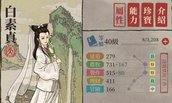 白素贞特别适合用于伐木场,因为能降低60%的原木需求,同时还可以减少1名工人的需求,是专门收集木板的角色。