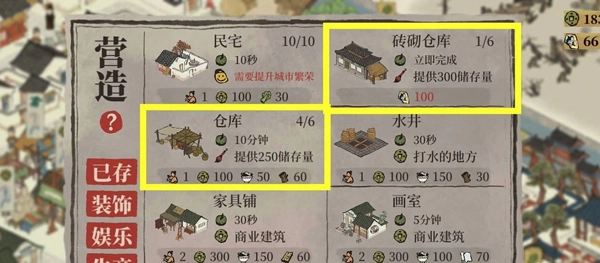 可以看到,用于存储物品的仓库主要分为两类:一类是普通仓库,建造时需要消耗材料并由居民参与,建成后能提供250的存储容量;另一类则是砖砌仓库,它的建造需要使用补天石,对应的存储容量为300。