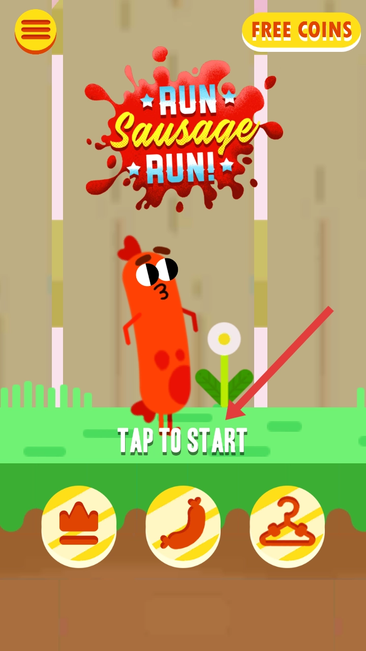 在游戏启动界面,点击【TAPTOSTART】按钮,即可进入【RUN-SAUSAGE-RUN!】的游戏关卡。
