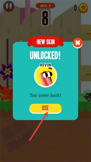 解锁【NEW-SKIN】后,点击【USE】按钮切换至【KEVIN】皮肤,即可继续参与游戏挑战。