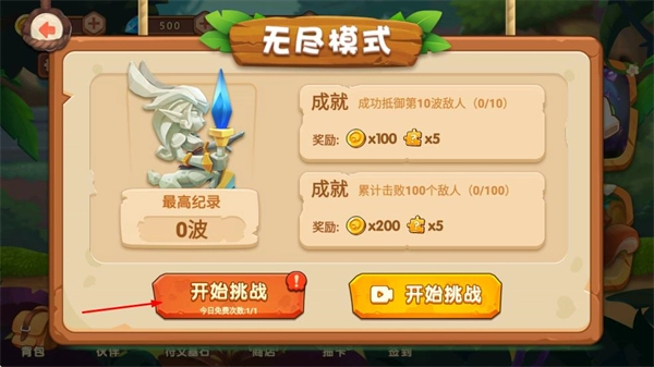 在无尽模式的界面中,点击“开始挑战”即可参与生存类关卡,只要达成击杀目标就能获得相应奖励,还能挑战更高的波数记录。