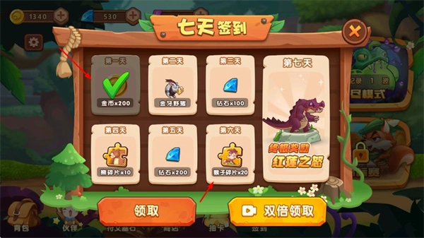 在七日签到页面,点击领取按钮即可获取当天的奖励;若想获得双倍奖励,还能通过观看视频来解锁,以此积累资源,助力阵容的强化。