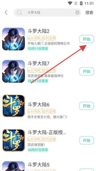 在搜索结果里找到像【斗罗大陆2】这样的对应游戏,然后点击【开始】按钮就能游玩了。