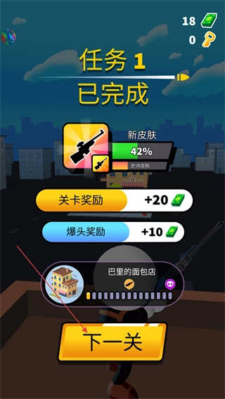 完成击杀任务后,你能获得关卡奖励,还能提升新皮肤的解锁进度,点击下一关即可继续挑战。