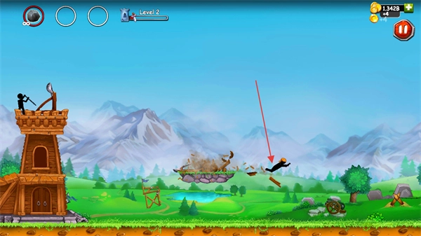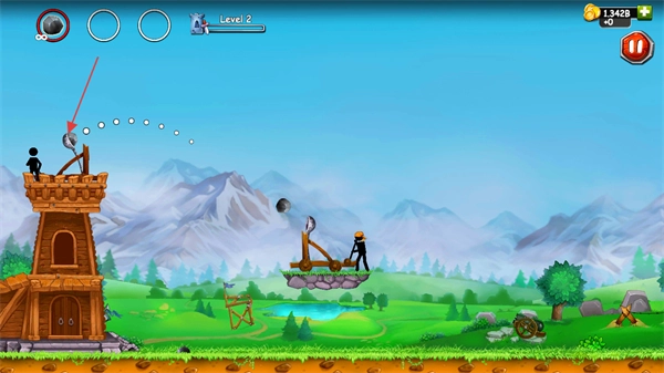 长按并拖动投石机来调整抛物线以完成瞄准,松开手指就能发射投石机发起攻击。