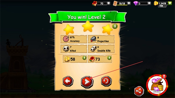 击毁所有敌方投石机平台,完成关卡进度任务即可通关,点击下方按钮继续下一关的挑战。