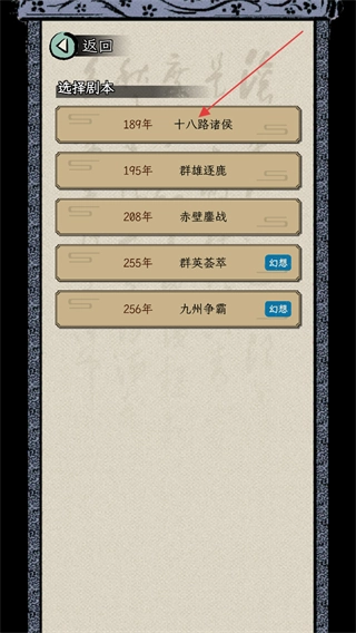 打开三国人生模拟游戏后,先进入剧本选择界面,挑选一个你想体验的剧本并点击进入即可开始游玩。