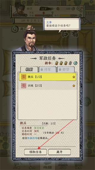 在军政任务板块中,先点击校尉级别的任务选项,接着找到未完成的任务并点击,查看下方的任务描述后,再点击领取任务按钮。