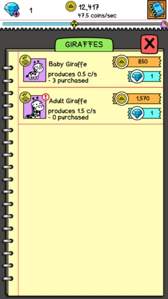 为拥有长颈鹿打好基础:先用初始的金币或者前期攒下的金币,在商店里挑选购买基础品种的长颈鹿,购买的数量可以依据当下的金币储备来灵活调整,保证至少要有两只同一个品种的长颈鹿。