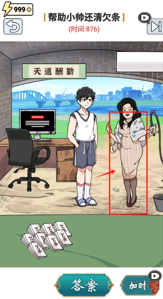 继续推进还债任务的完成,留意室外女生的动态,通过合理运用加时道具来争取最终胜利。
