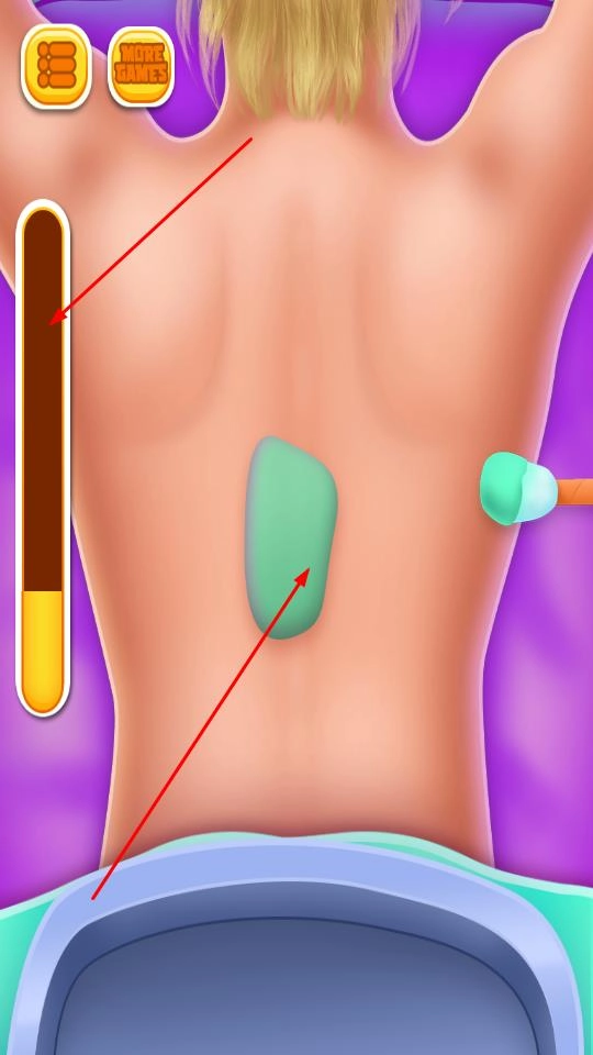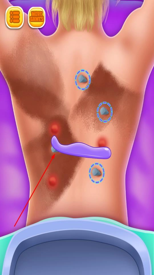 进入护理情境后,先观察背部异物的分布情况,再挑选合适的工具——比如用紫色工具来清理嵌入皮肤的石块,接着按照提示进行精准操作,最终将异物移除。
