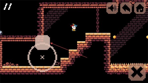 操控角色移动时,连续点击两次即可避开场景里的尖刺陷阱,继续朝着金币所在的位置前进,从而完成资源收集与关卡探索。