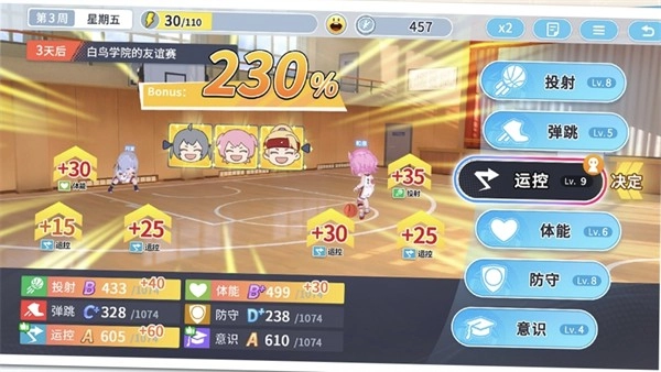 在这款游戏里,各位教练能够借助训练系统,对不同位置的球员进行培养,还能个性化地挑选想要提升的球员属性,包括投射、弹跳、防守、体能、运控和意识。只要完成训练目标,就能助力球员实现球技的进步和战斗力的增强。进而组建出最强的球队,向着全国大赛发起冲击!