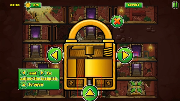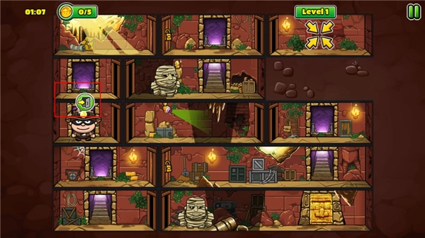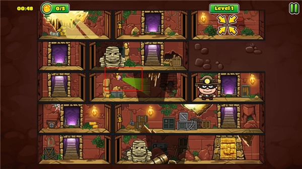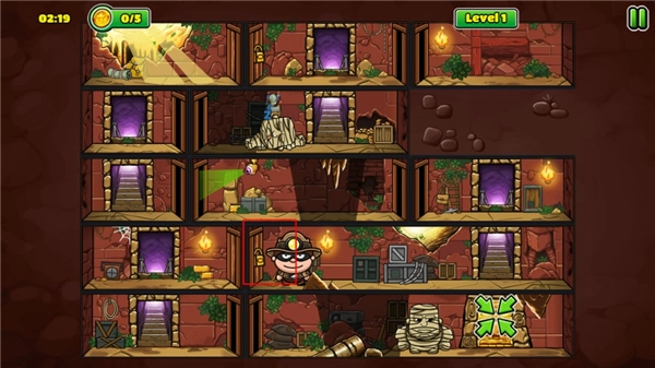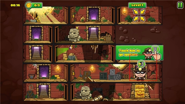这是一个很有意思的玩法:点击屏幕就能控制鲍勃前进,你需要仔细观察路线,找到可以通行的门进入下一个房间。途中会遇到各种机关,得动动脑筋才能通过,而且每种机关的方法都不一样哦。碰到木乃伊时,要趁它没留意赶紧把它打晕;遇到带锁的门,就用万能钥匙打开;有摄像头的区域一定要小心躲避;要是碰到电梯,就得去别的地方找密码才能使用。还有各种各样的障碍等着你来解开,不过最重要的事情,当然是收集金币啦!