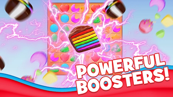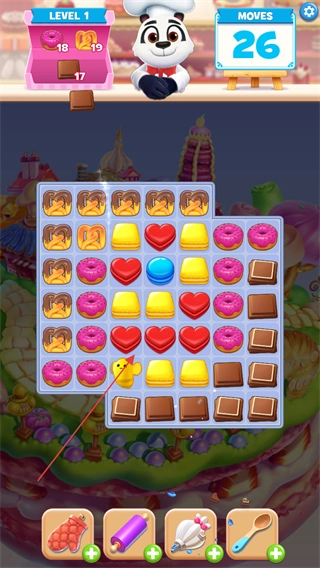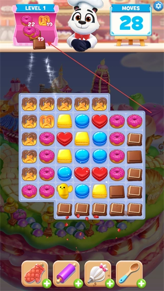 打破传统三消游戏仅有一种消除效果的局限,依据曲奇的匹配数量与形状差异,可依次解锁特殊曲奇、彩虹蛋糕、三明治蛋糕这三类特殊道具,且每一种道具都具备别具一格的大范围消除能力。