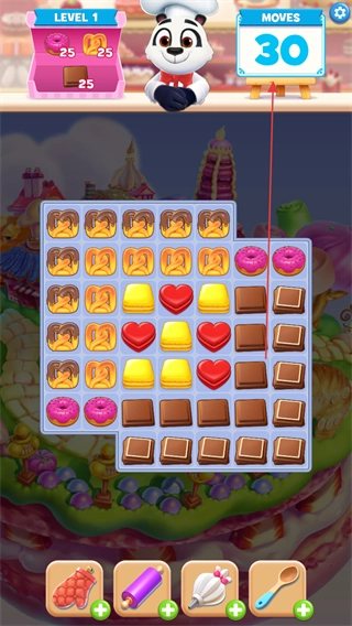 查看LEVEL1的目标需要收集指定物品,同时要留意MOVES30的步数限制,提前准备好消除对应的饼干。