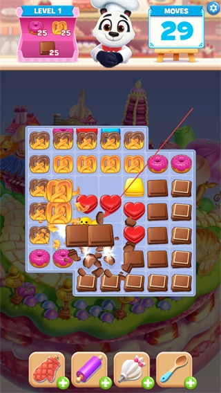 拖动相同图案的饼干连成线,就能触发消除效果,此时MOVES会减少到29,同时还能获取对应的道具。