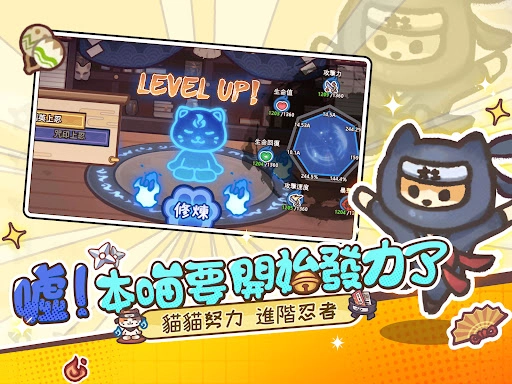 在《忍者喵喵喵》里,玩家能够学习并升级火焰、雷电、风暴等各式各样独特的忍术技能。