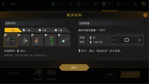 第二个途径是在仓库里用军衔积分购买。每天挑战玩家最多能拿到5000积分,而且军衔等级越高,能买的材料数量就越多,每天邮件奖励的积分也会更多。因此建议大家每天尽量把5000积分打满。