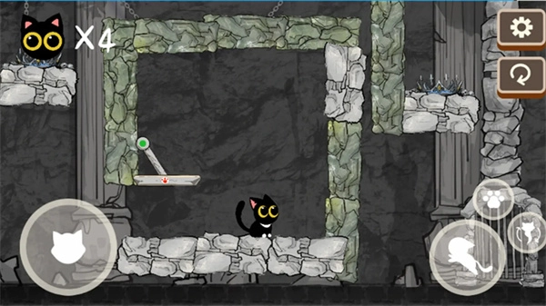进入关卡后,操控小猫前往拉杆所在位置,点击右侧的按钮,就能控制石柱或机关转动了。