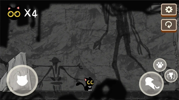 进入游戏后,界面左侧用于控制小猫移动,右侧则负责小猫的跳跃、交互以及技能操作。