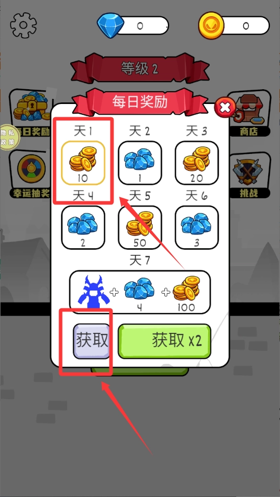 进入游戏界面先领取第一天签到奖励。