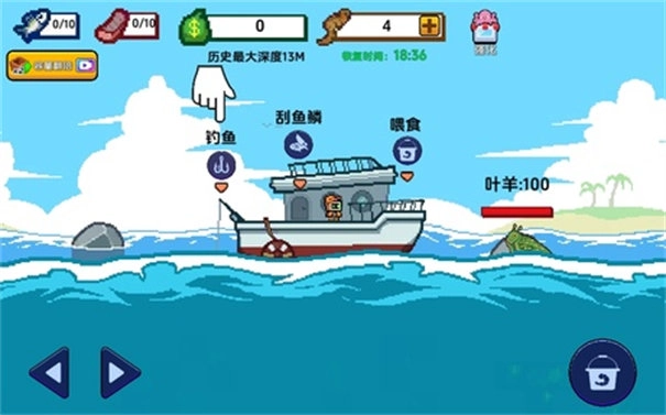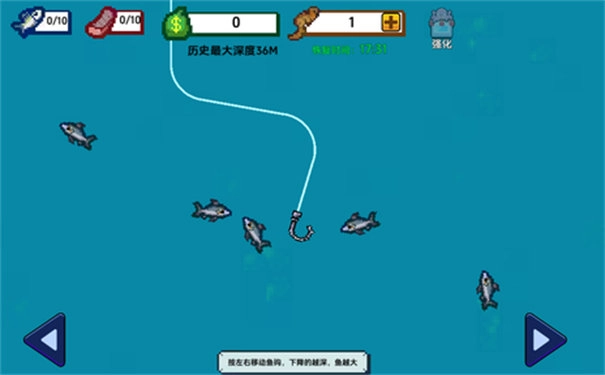 你可以通过操作右下角的按键来调整鱼钩的朝向。当鱼钩碰到鱼时会使其受伤,等伤害累积到一定程度,就能把鱼钓上来了。