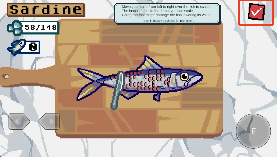 这是一款考验耐心与细心的游戏,玩家在成功钓到鱼后,得返回船舱给鱼处理鱼鳞——得用小刀小心翼翼地刮,要是太急躁,很容易刮伤鱼的表面,留下一个个红疙瘩,这样鱼的售价就会降低。所以,努力刮出一条毫无瑕疵的完美鱼吧。