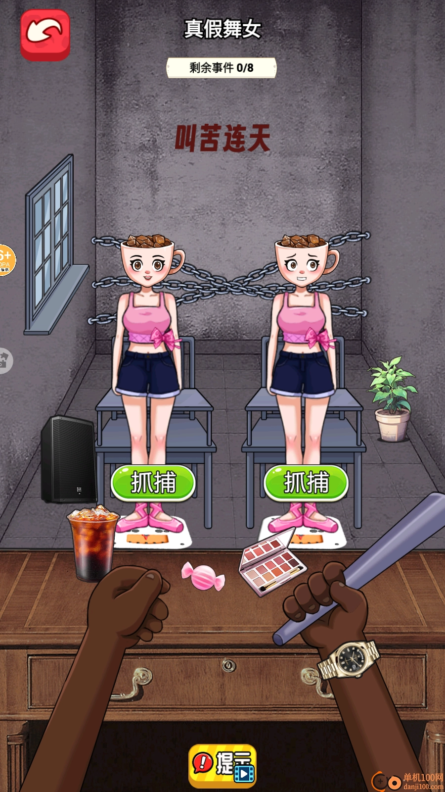 呈现真伪舞女辨别界面,把桌上的物品拖拽至舞女身上,查看对应的提示信息,将假扮的角色抓获。