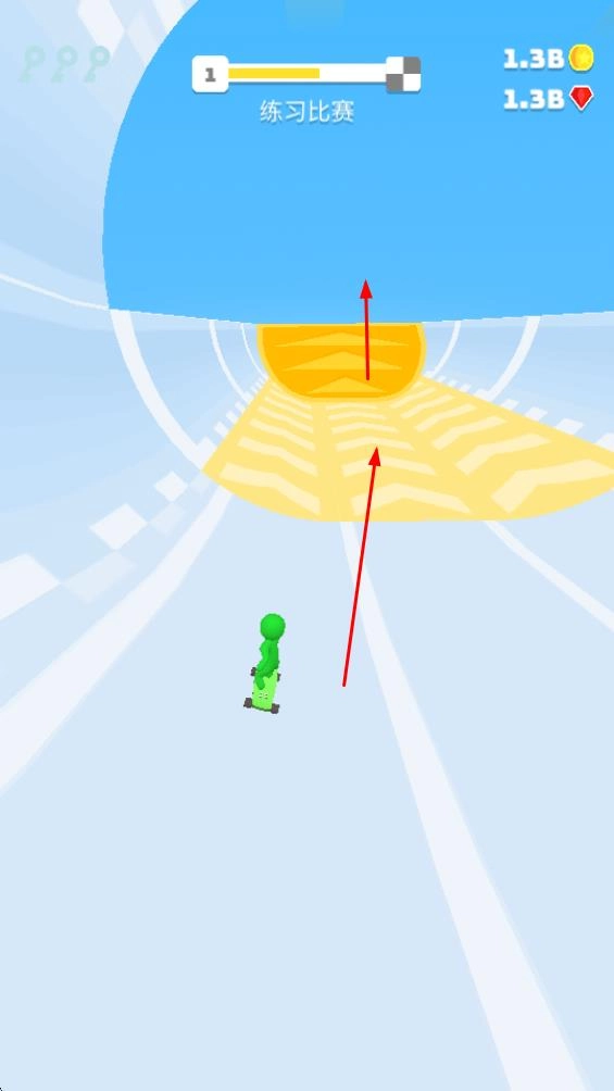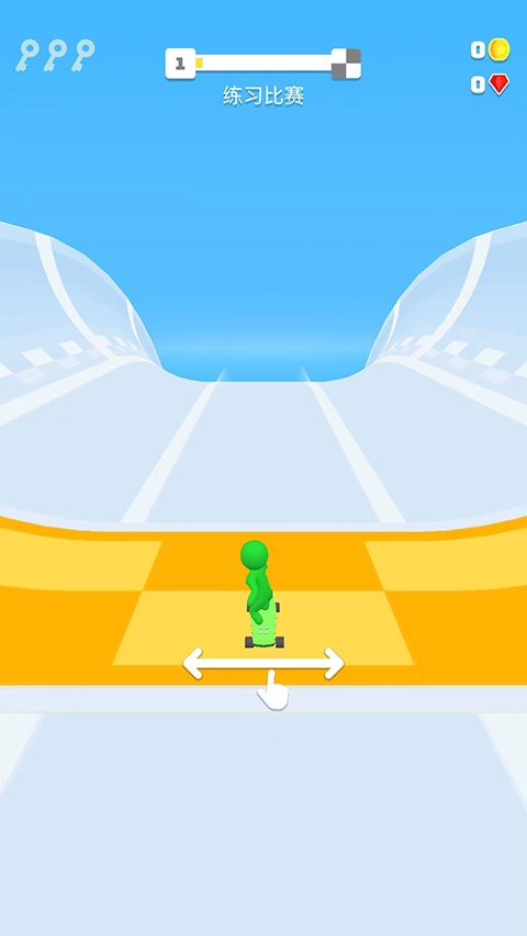 进入练习赛模式后,操控滑板角色在赛道上移动,避开红色障碍物,顺着赛道方向行进,熟悉赛道的操作方式与节奏。