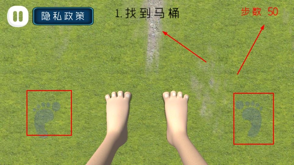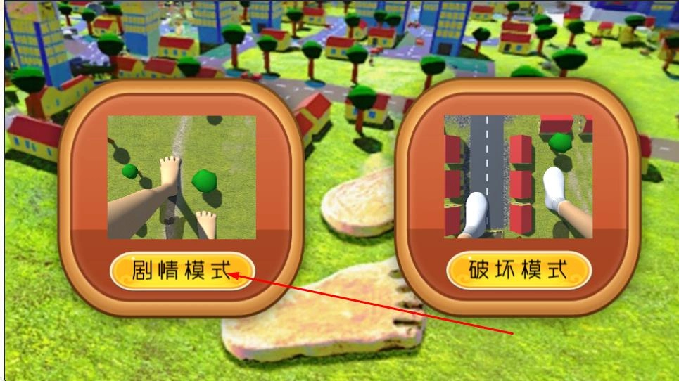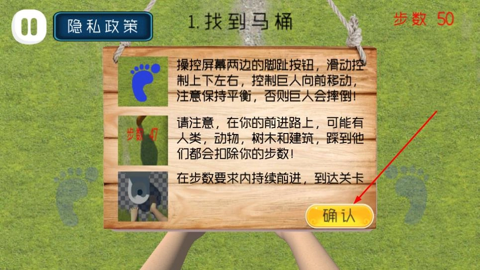 在剧情模式开启前,会弹出操作提示界面,通过操控屏幕两侧的脚趾按钮、滑动来控制巨人移动,行进过程中踩到物体将扣除步数等规则,点击确认即可继续。