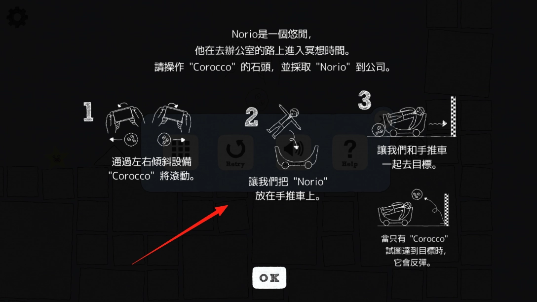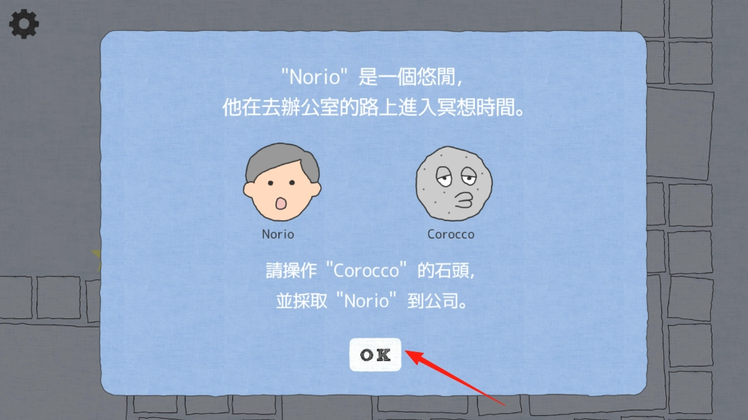 点击OK按钮即可开启游戏流程,你需要操控名为Corocco的石头,设法将Norio送往公司,以此启动关卡的核心运输任务。