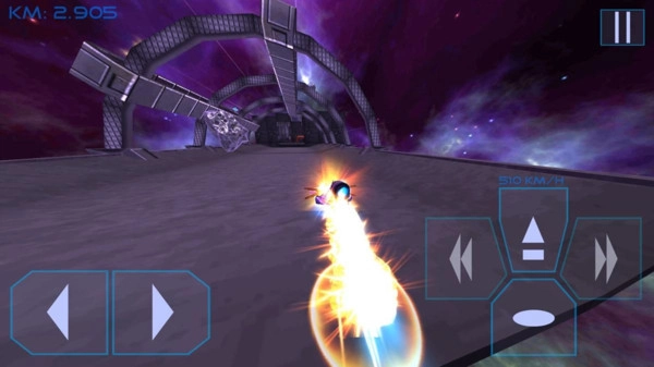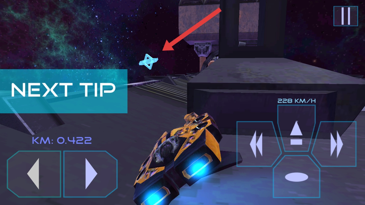 请按照指引操控悬浮车,收集蓝色星形道具以推进关卡,同时留意“NEXT TIP”获取操作提示。