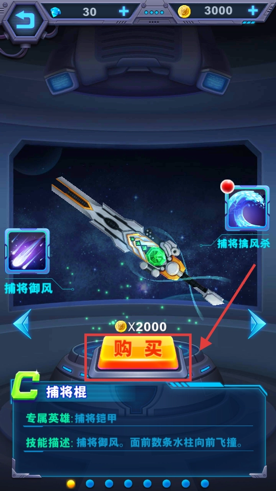 花费【2000】金币购置【捕将棍】,此武器为【捕将铠甲】专属配备,能够解锁【捕将御风】技能以提升战斗能力。