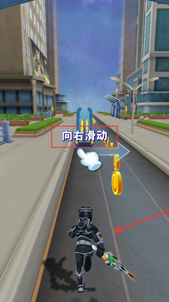 按照“向右滑动”的提示来操作,把角色位置调整到右侧,这样既可以收集到金币,又能顺利避开当前关卡的障碍。