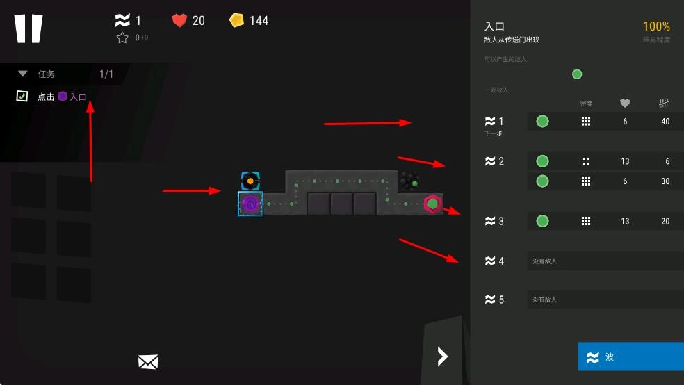 点击紫色入口,启动敌人波次进攻,这是触发防御战斗的关键操作,开启塔防挑战之旅。