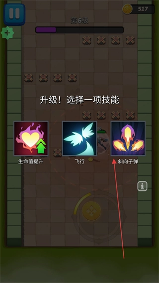 升级时挑选合适的技能,比如斜向子弹,以此优化攻击方式、扩大攻击范围,从而增强自身战力,以便更好地应对后续出现的更强敌人。