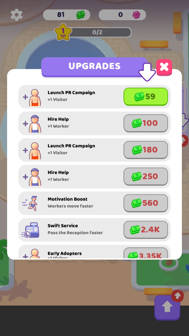 乐园成长进阶路径:从初始小型乐园起步,随着收入积累逐步解锁更多大型水上项目与装饰元素,乐园规模、设施丰富度与知名度同步提升,形成清晰的建设吸引游客盈利升级。