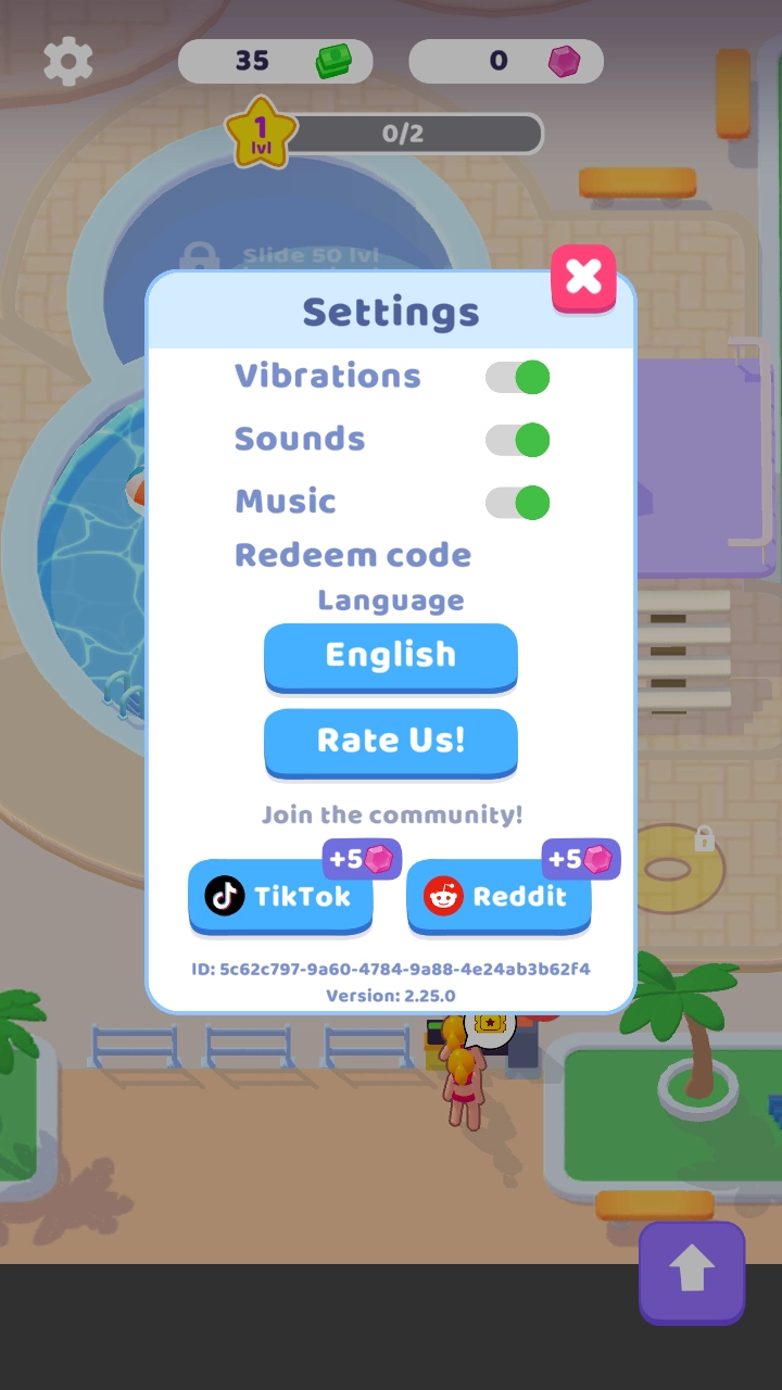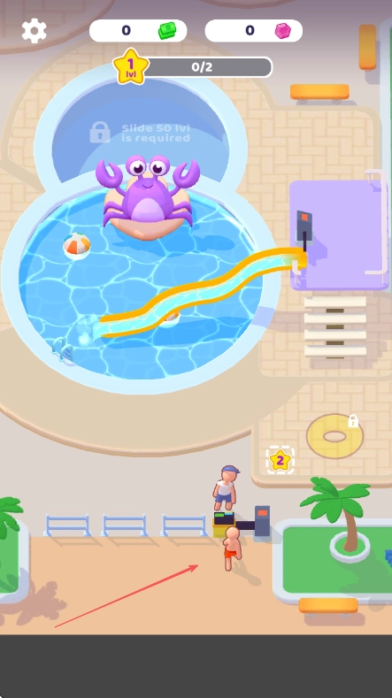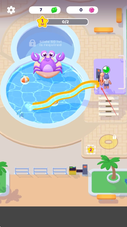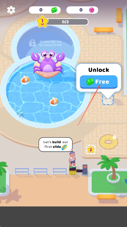 进入游戏后,能看到泳池和螃蟹造型的装饰,点击Unlock下方的Free按钮,即可解锁滑梯。