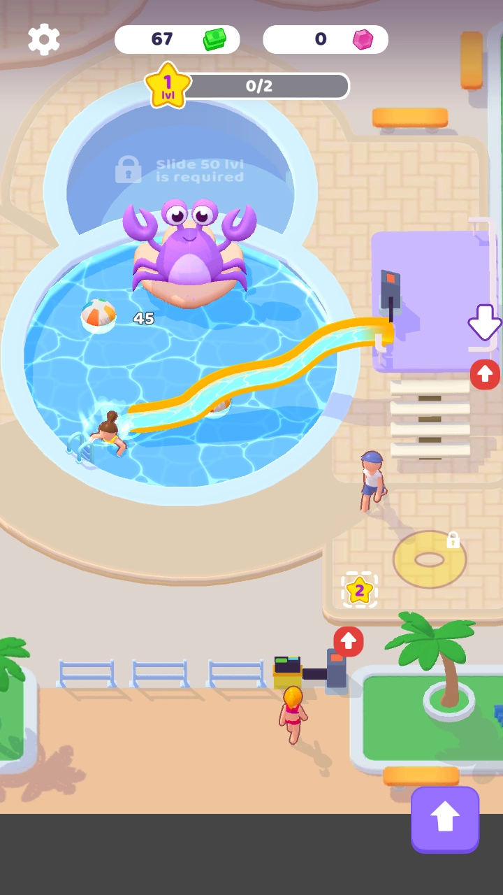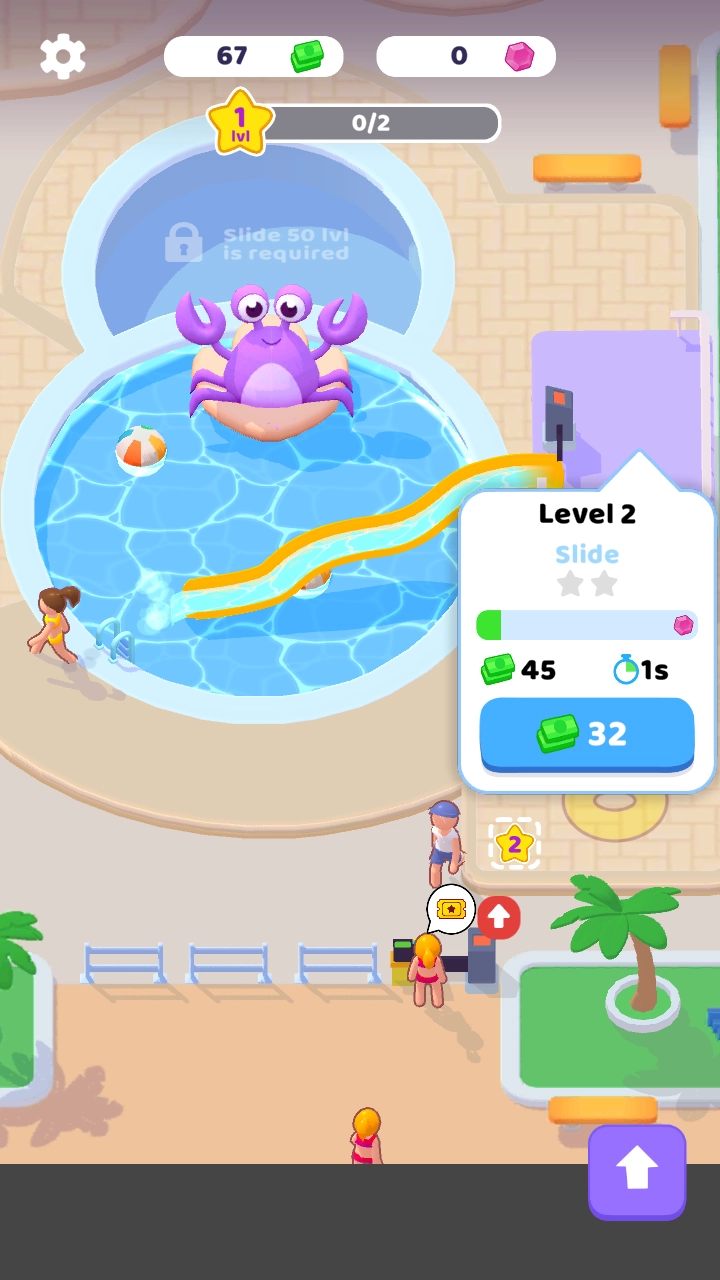 小人通过滑梯滑进泳池完成体验,持续积累货币解锁更多设施来升级乐园。