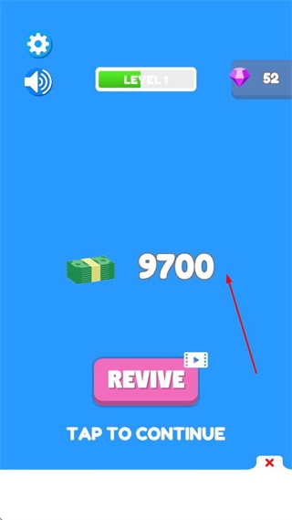 若挖矿过程中失败,会显示获得的金钱数量,可选择REVIVE或点击TAP TO CONTINUE继续游戏,积累的金钱可用于后续升级等操作。