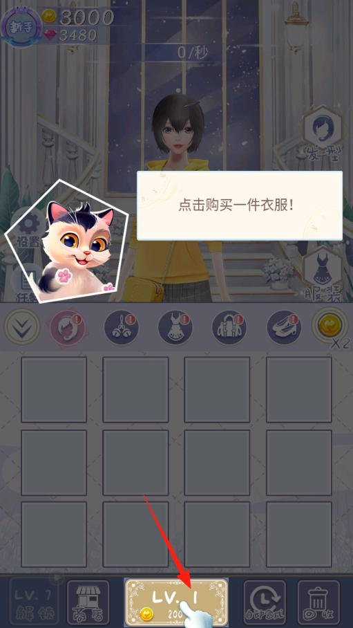 在衣柜界面,按照提示点击LV.1,花费金币购买新衣服,借助等级解锁的机制来获得基础服饰,通过这些操作丰富衣柜里的内容,感受资源消耗与服饰收集的玩法,推动装扮的进度。