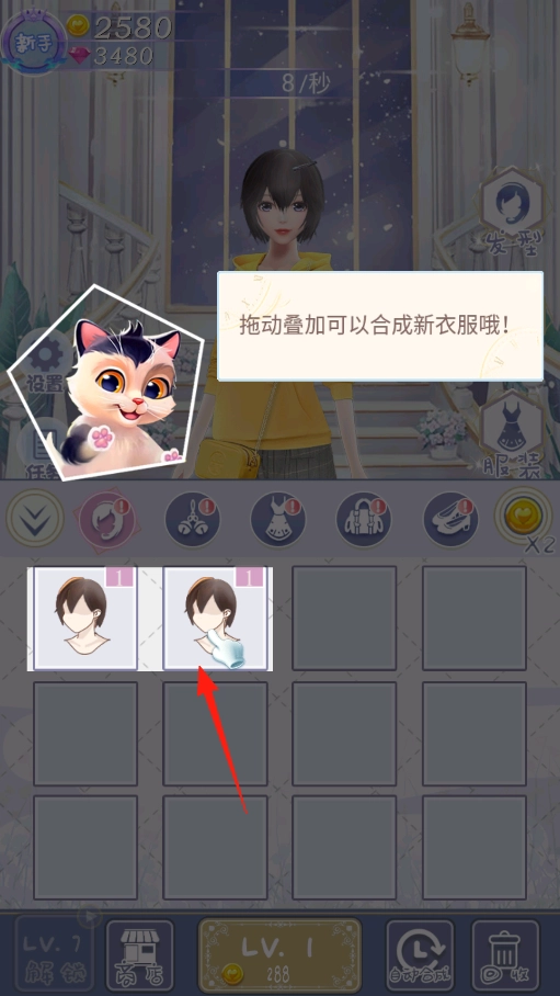 完成新衣购买后,按照提示拖动服饰,将相同的服饰叠加起来合成新款式。利用这一合成机制,你可以解锁更进阶的装扮。通过实际操作,不断探索服饰升级的路径,尽情感受创意合成带来的乐趣,从而丰富角色的穿搭选择。