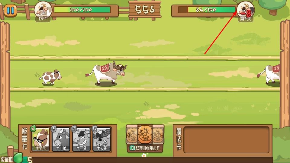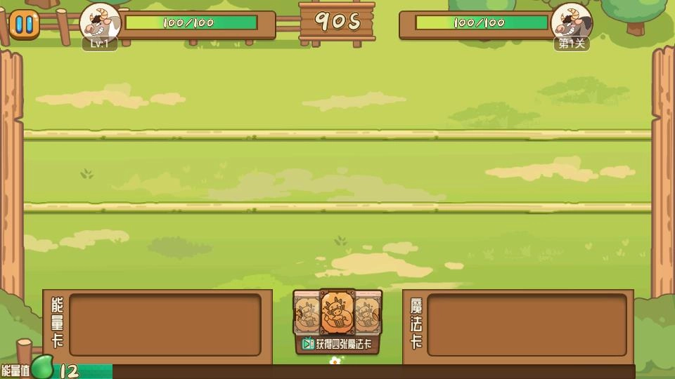 战斗前可消耗能量值挑选能量卡(例如牛大哥)安排上阵,再搭配魔法卡(比如冰冻),以此为对战做好准备,而能量值的多少决定了能使用的卡牌数量。