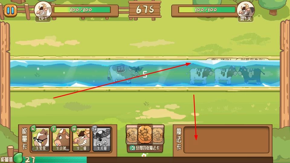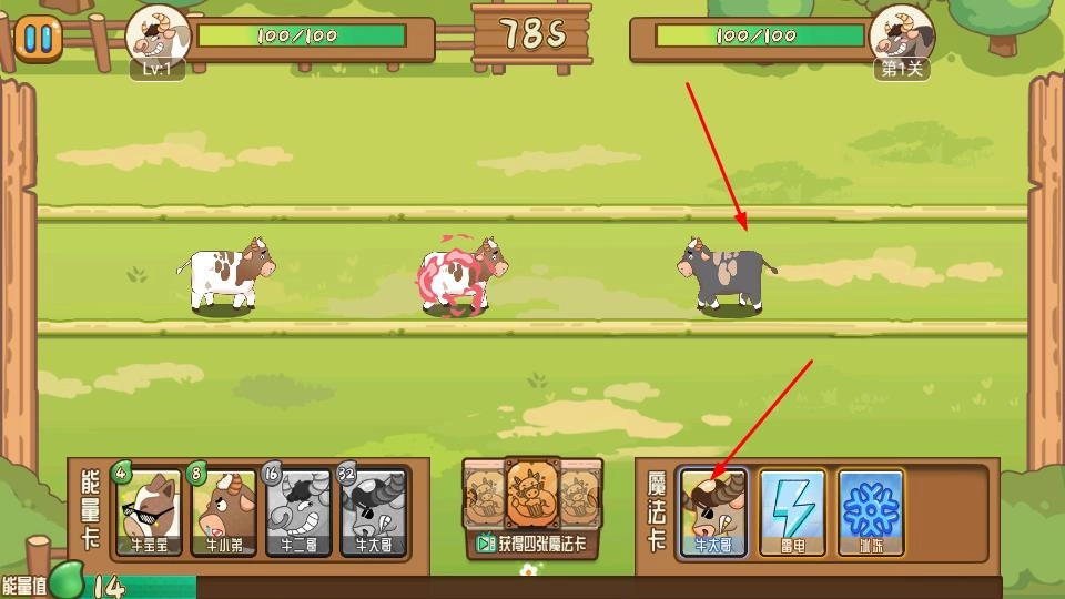 然后在对战过程中点击冰冻这类魔法卡释放效果,以此冻结敌方牛群,阻碍它们的行动,再依靠己方牛群发起攻击,逐步消耗敌方的血量。