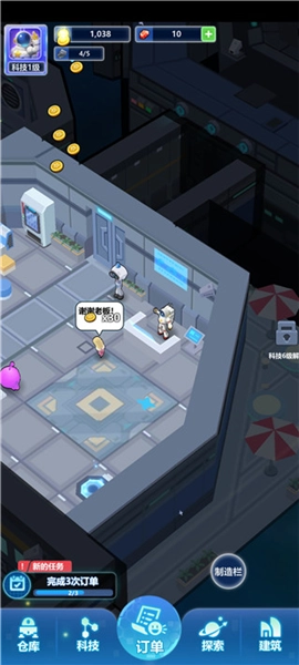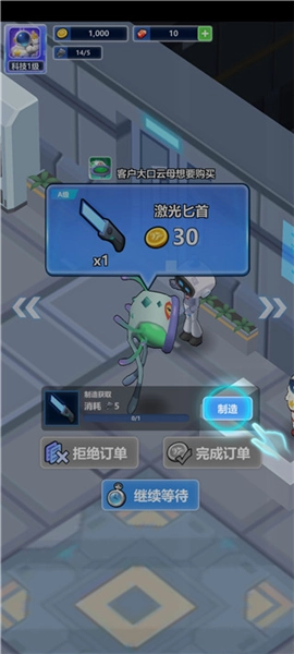 基地发展到一定阶段后,太空生物顾客会主动前来下单。你需要点击顾客头顶的气泡查看具体需求,接着点击“制造”按钮来制作所需物品,完成订单后就能获得金币奖励。